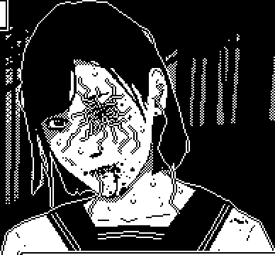 Wet splash behind you makes you stop. You slowly turn around to see a young girl slowly walking in your direction, In her eyeball, there's a swarm of disgusting worms. One of them falls to the floor with a wet splash....