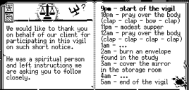 Upon visiting the body between 10 and 11pm, the player also has the option to copy the tattoo on the Horrible Old Man's foot, which is added to the top right of the first page. Upon ending the mystery, the Vigil Pamphlet is automatically discarded from the player's inventory or storage.